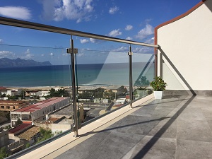 Ringhiera balcone in acciaio inox lucido AISI 316L e vetro, realizzata con montante e corrimano in tubo tondo, supporti reggi vetro saldati al montante