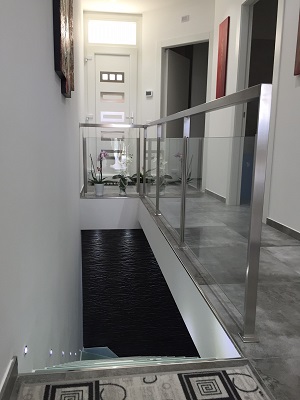 Ringhiera soppalco in acciaio inox satinato AISI 304L con pannello in vetro